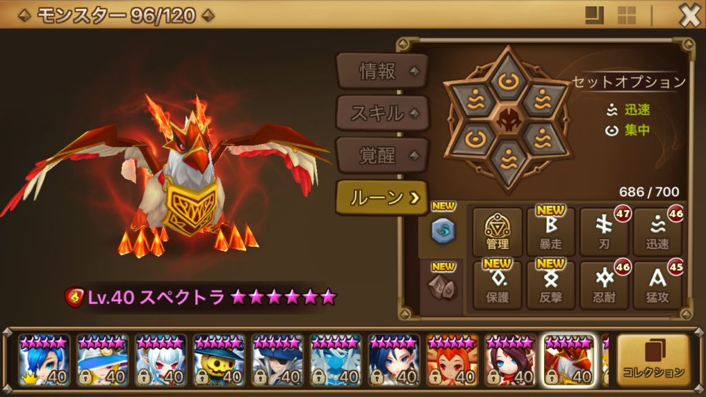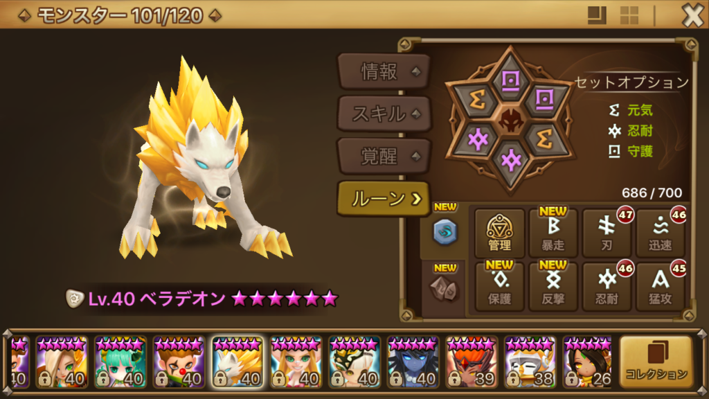 とりあえず、次におすすめするモンスターを育成してみてください!!参考までに、セットしているルーンの種類が分かるように画像を張っておきます(そうすると逆にステ見れない問題が勃発しますが)。