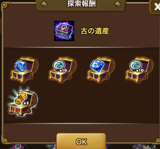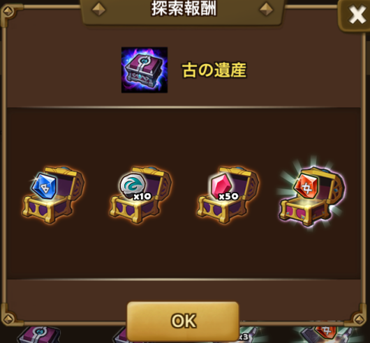 また、タルタロスを撃破することができれば、撃破した速度によってSSS~Cまでのいずれかのランクに応じた数の古の遺産(宝箱)を開けることができます!SSSであれば7個、Cランクであれば1個の宝箱を開封できます。ちなみにおいらが所属するギルドは平均Sランクでクリアできているので、古の遺産を5個もらえます。古の遺産は、各種召喚書やクリスタル、練磨石、ジェムなどが入っており、稀にデビルモンが入っていることもあります!!