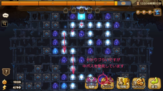 迷宮の1マスを叩いて勝利すると、ルーンや練磨石、ジェムがもらえます。練磨石やジェムがゲットできれば巨人・タワー・ドラゴン攻略のためのルーンを底上げすることができるので、なるべくプレイすることをおすすめします!