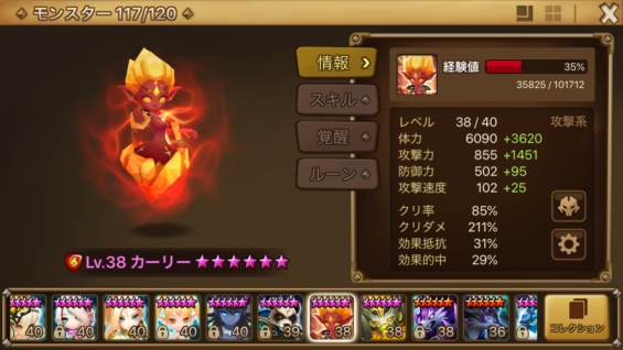 カーリーが後回しな理由としては「6番ルーンに攻撃%が必要だから」ですね。激怒、刃、意志、いずれにしても6番ルーンの攻撃%はかなり余りにくいです。セットしたいモンスターが多いので。逆に6番防御%はそこまで需要がない。なのでコッパーやブルドーザーにも回すことができます。
