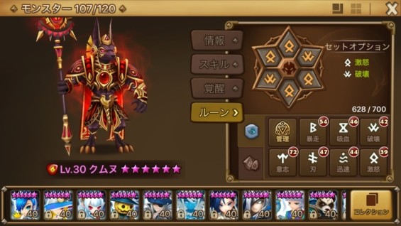 激怒+破壊で組んでいます。「激怒の6番体力%」という正直使いにくいルーンですがクムヌならしっくりきます。そういうルーンを活用できるモンスターってありがたいっすね。